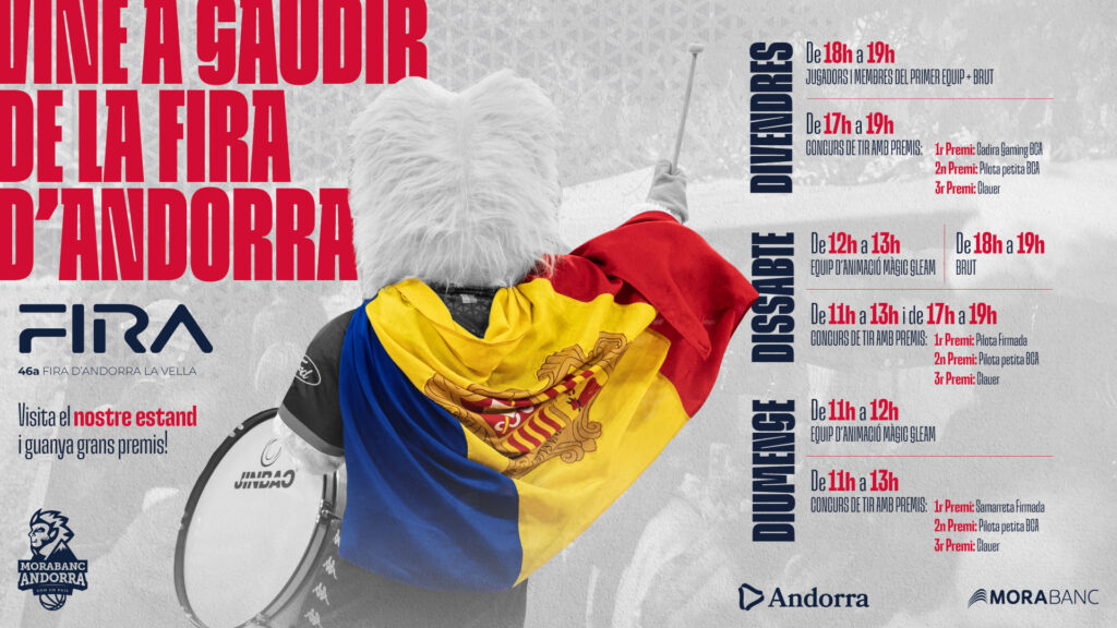 El BC MoraBanc Andorra estará presente en la 46ª Fira de Andorra la Vella, que se celebrará del 24 al 26 de octubre, con un estand lleno de concursos y animación. El momento más destacado llegará el viernes, de 18 h a 19 h, con la visita de los jugadores y el cuerpo técnico del primer equipo, que saludarán a los aficionados y firmarán pósters oficiales.